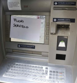 写真には"FUORI SERVIZIO(使用不可)"って書いてありますね。 以前にもイタリアの預金封鎖については下記で書いたよね。 ギリシャの預金引き出し、約710億円に 国民に不安 - 2012/05/18/15:00今現在、スペイン10兆円支援でユーロ安心なんて 意味不明なことを言っているけれども、 スペイン銀行への支援、トロイカが監視へ=欧州委員 - ロイター2012/06/11/21:28