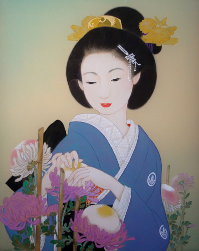 佃 喜翔 『重陽/菊の着せ綿』 菊の節句「重陽」に向けて菊の花に着せ綿をする宮廷の若い女官をイメージした美人画 『重陽の節句』 【季節の言葉103】 本日9月9日 日曜日は『重陽の節句』です。