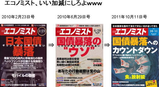 「エコノミスト」は信じられるのか 「国債暴落」で正反対の特集 J-CASTニュース 2011/10/ 7/ 11:28 http://www.j-cast.com/2011/10/07109330.html 週刊エコノミスト(毎日新聞社刊)2011年10月11日号の巻頭特集「国債暴落へのカウントダウン」がツイッターで話題だ。 注目はその見出しにある。じつは同誌では10年2月23日号で「日本国債暴落」、その4か月後の6月29日号で「国債暴落の『ウソ』」の見出しで売り出していた。いったい、国債暴落はウソなのか、ホントなのか。 「節操ない」と失笑買う 興味のある方は、"つづきはこちらです"をクリック! |