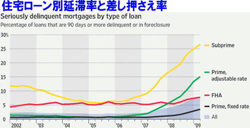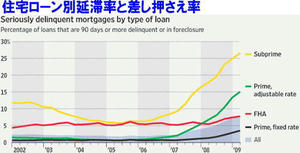 米住宅ローンの延滞・差し押さえ率、過去最悪 4~6月期、計13% 【ニューヨーク=清水石珠実】米抵当銀行協会(MBA=Mortgage Business Association: 抵当銀行協会)が20日に発表した2009年4~6月期の住宅ローン調査によると、住宅ローンの延滞率と差し押さえ率の合計が13.16%(季節調整前)となり、過去最悪を記録した。全米の住宅ローンの7~8件に1件が返済に問題を抱える計算となる。景気後退が長引くなか、雇用環境の悪化が続いていることが響いた。 住宅ローンの延滞率(季節調整値)は9.24%と、前の期と比較して0.12ポイント上昇。差し押さえ率は4.3%と、0.45ポイント高まった。住宅バブルが過熱したカリフォルニア州やフロリダ州などで、高水準が続いている。 Delinquencies Continue to Climb, Foreclosures Flat in Latest MBA National Delinquency Survey MBAのチーフエコノミスト Jay Brinkmanのコメント (住宅ローンの)問題は、プライムローンへと移行している