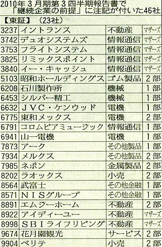 3月決算企業のうち、2010年3月期第3四半期(09年10~12月期)に経営上大きなリスクを抱えているとして「継続企業の前提」に注記が付いた上場企業(東証、ジャスダック)が計46社に上ったことが、両取引所の集計で分かった。世界的な不況を受けて、企業の監査ルールは09年3月期以降、大幅に緩和されているが、重大リスクを抱える企業は依然高水準で推移している。 会計ルールにより、上場企業の経営者は自分の会社に経営を続けていく上で重大なリスクを抱えていると判断したら、リスクの中身と対応策を決算書などに明記しなくてはいけない。 また、経営をチェックする監査人も、担当企業に重大リスクが存在すると判断した場合、監査報告書に注意を促すための「注記」を記載する。投資家にとって注記は、監査人が認めた「イエローカード企業」という意味合いがある。 興味のある方は、"つづきはこちらです"をクリック!