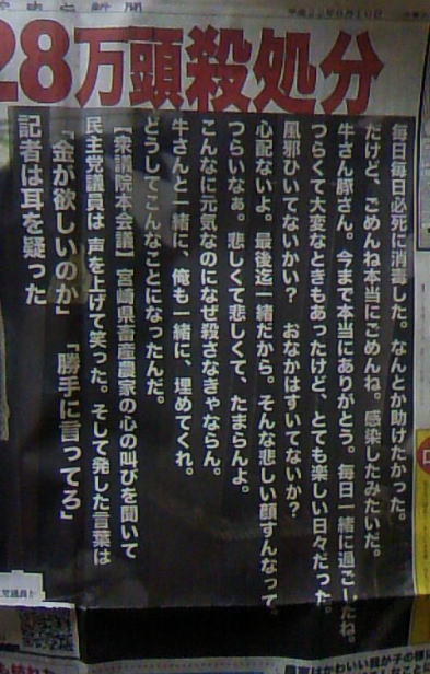 しかし総理はこの極めて重要な会合をほっぽり出して、民主党広報用写真撮影をしていたのだ。おそらくメイクをして、にっこり笑みを浮かべてモデルを務めていたのだろう。「緊張感を持って一丸となって対応していきたい」という総理自身に全く緊張感がなく口蹄疫より選挙が第一、言葉は「うそばっかりだ」「選挙用パフォーマンスだ」(畜産農家の声)ということを自ら証明した。 それもそのはず、この日は国内最大規模の畜産地帯都城市でも感染が確認され宮崎県は牛208頭を殺処分した日だ。都城市は川南町など県東部から約50キロ離れている。政府の感染封じ込め策が失敗していたことが明らかになったのだ。全国の畜産農家は大きな不安に包まれ、都城や隣接する鹿児島県では一刻を争う防疫対策に追われ、政府の新しい対策や感染ルートの解明を望んでいた。口蹄疫対策本部でやらなければならないことは山ほどあるはずだ。なぜこんな緊急事態に対策本部を途中退席してまで広報用写真を撮影する必要があったのか。そんなことをやっている場合ではないと普通の日本人なら思うはずだ、菅直人総理は宮崎や日本のことなどどうでもいいのだ。 民主党の広報用写真がどのようなものか注目してみたい。宮崎県民、全国の畜産農家の方々はその写真をどのような思いで見るだろうか。「緊張感を持って一丸となって対応していきたい」と言いながら途中退席して、ニッコリ写真撮影。畜産農家から「鳩山以下」と言われても当然だ。 ■□━━━━・・・・・‥‥‥……………………………… ワタシには観える・・・・・ワタシには観える・・・・・・・・・・ これから各種メディアを通して、中国産や韓国産牛肉のアピールが始まる・・・ ワタシには観える・・・・・ワタシにはハッキリと観える・・・・・・・・・・ ワタシには予知能力があるのだろうか??? 2010.5.20【口蹄疫問題】江藤拓議員(衆議院本会議) 「ずっと謝ってろ」 PR |