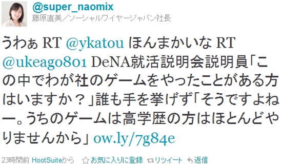 「モバゲー」のDeNA「うちのゲームは高学歴の方はやりませんから」 -就職説明会の内容をブログで暴露? ヲタにゅぅ 2011年11月3日 21:00 http://www.otanew.com/news_RY7AqIvAY.html ■「モバゲー」の対象ユーザーは低学歴!?