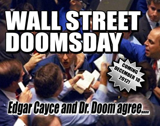 ヌーリエル・ルービニ(破滅博士)と予言者エドガー・ケイシーによれば、ウォール街は今年の12月に大きな暴落に見舞われる。 伝えられる所によると、ニューヨーク大学の教授であり、ルービニ・グローバル・エコノミックスの会長であるヌーリエル・ルービニは、今年の12月18日までに株式市場が大きな暴落に見舞われると語ったという事である。 ウォール街のエグゼクティブに近い筋によると、切迫した景気の失速が「世界金融システムの破裂」を引き起こすとルービニは感じているらしい。 最も衝撃的なのは、2012年の12月に大きな株式市場の暴落があると、「眠れる予言者」として知られるエドガー・ケイシーが1940年に遡って予測したという事である。 43年という人生において、エドガー・ケイシーは将来を予測する不思議な能力を示した。 伝えられる所によると、ルービニは長年に亘ってケイシーの支持者であり、12月に株式市場が暴落するという事について彼に同意しているという事である。 暴落は米国においてだけで無く、世界中の主要な市場が暴落するとケイシーは予測したのである。 伝えられる所によると、12月の暴落は、世界中の更なる景気減速の10年間の始まりとなり...そして、次の50年間は人類の歴史において最も繁栄した幸福な時になるとケイシーが予測したという事である。 ウォール街の人々の多くはルービニ及びケイシーの予測を当てにしていないが、12月初旬時点での売り注文を既に仕込んだマネー・マネージャーが大勢いるのだ。