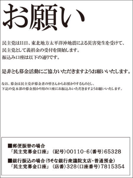 Yahoo!基金で東北地震の義援金を募集 - Yahoo!ポイントも利用可能 ヤフーは、3月11日に発生した「東北地方太平洋沖地震」などの被害向けに、Yahoo!基金による募金活動を実施している。 Yahoo!基金は、「インターネット社会の安全で健全な発展」および「災害被災地への速やかな支援」を目的とする組織。ヤフーが、社会貢献活動の一環として運営している。Yahoo! JAPAN社員からボランティアメンバーを選出して活動を行っている。過去には、ニュージーランド地震をはじめとする災害救援金のほか、紛争地域の復興支援、がん基金などの医療向け支援等も募っている。 募金方法は、Yahoo!ウォレットもしくはYahoo!ポイントから選択できる。Yahoo!ウォレットの募金額は500円~10万円。こちらで募金すると専用の壁紙をダウンロードできる。一方、Yahoo!ポイントの場合は、1~100,000ポイントを募金でき、1ポイント1円で換算されて拠出される。 Yahoo!基金「東北地方太平洋沖地震」緊急災害募金 ■□━━━━・・・・・‥‥‥……………………………… そのほかにも、 共産党京都府委員会 グルーポン 民主党 ・・・と、あるんだけれども、なぜ与党が政府としてではなく、 この党は、金がからむと本当に迅速に対応するなぁ~・・・・・ 本来は、特定の政党としてではなく先に「日本国政府」として せめて「日本国政府の東北大地震災害募金口座」 とかを開設して情報開示を徹底してよ! |