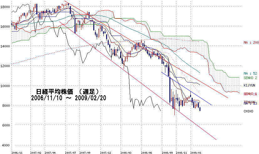 そのまま素直に計算すると到達点は『\5,763-』となります。 今回、NYダウの底割れと言う事で、6000円割れの可能性が大です。 どうも素直に行ってくれるようには思えないのです。 なぜか今回は、中途半端に下げて、その後\8,200-処を目指し これが今回のワタシの私観です。全くもって根拠のない内容で |