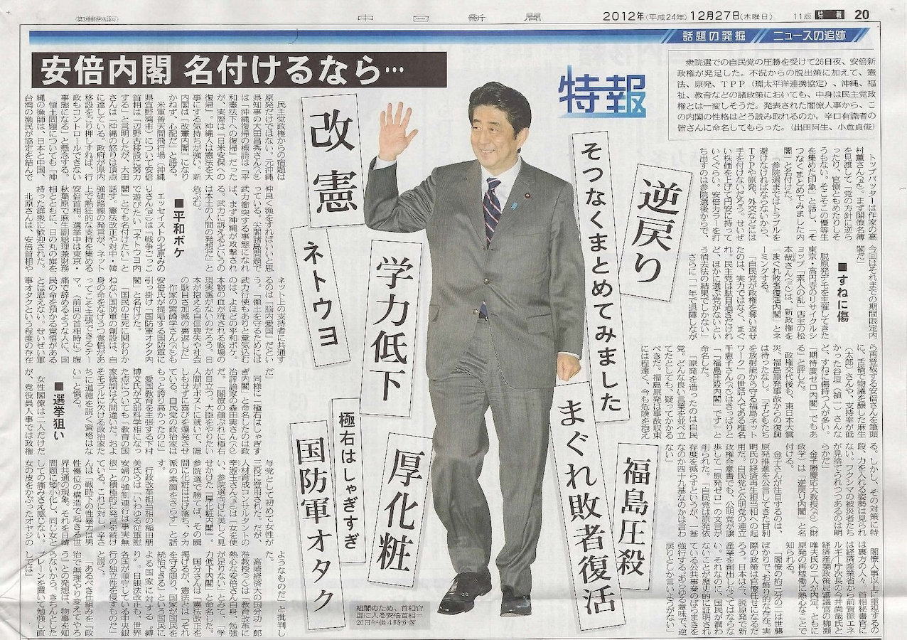NHKが「安倍政権に対する海外の反応」で中韓だけ扱い炎上 ガジェット通信 2012/12/27/ 13:15:21 http://getnews.jp/archives/281202 26日放送、「NHKニュース7」(NHK総合)の報道内容に対し、「酷すぎる」とツイッター上で物議を醸している。 同番組では、同日発足した第2次安倍内閣について、「安倍政権に対する海外の反応」を取り上げた。しかし、テロップに「海外は」という見出しを入れておきながらも、実際には中国外務省の報道官のコメントをはじめ、中国と韓国の反応だけしか紹介しなかったという。