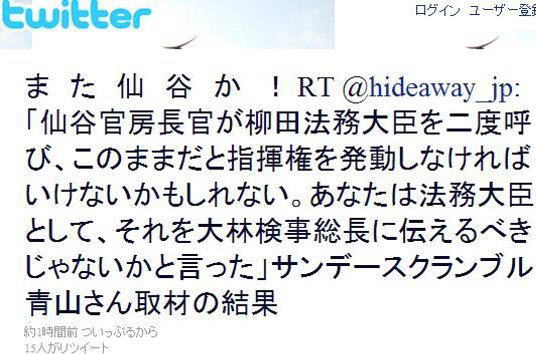 「仙谷官房長官が柳田法務大臣を二度呼び、このままだと指揮権を発動しなければいけないかもしれない。あなたは法務大臣として、それを大林検事総長に伝えるべきじゃないかと言った」サンデースクランブル 青山さん取材の結果 『サンデースクランブル』尖閣諸島問題 2010年9月26日(日)12:00~ |