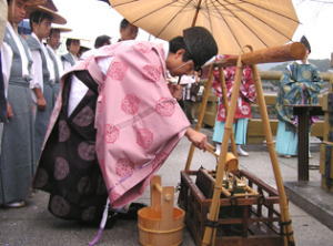 ◆名水汲み上げの儀 昔、豊臣秀吉が宇治川の水を汲んで茶会を開いたことから、 ◆茶壷口切の儀 行列によって名水が興聖寺本堂に運ばれると、「茶壷口切の儀」が行われます。 ◆茶筅塚供養 「茶壷口切の儀」の式典後、興聖寺山門前の茶筅塚で、