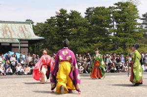 参観者は、宜秋門(ぎしゅうもん)から参入し、 御車寄(おくるまよせ)で金屏風(生け花)、 催しも色々とひらかれ、 11月3日(祝日)に 『五節舞(ごせちのまい)』が 11月7日(土曜日)に『雅楽(平安雅楽会)』が 11月8日(日曜日)に『蹴鞠(けまり)』が