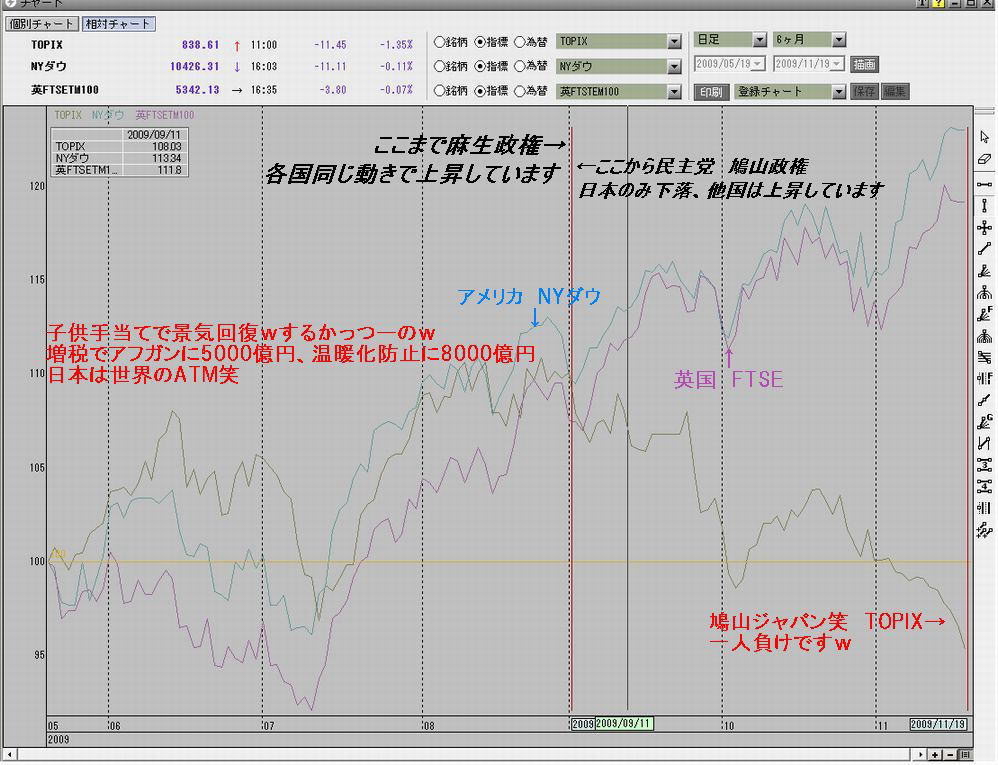 まぁ~まずは上記チャートを見てやって下さい。 ・・・って事で、世界中では大判振舞いのATM鳩ポッポ政権なのですが、 そして麻生政権時の、この44兆円で世界は助かったと言っても 麻生と鳩ポッポの違いは、麻生前首相は政治家であり、経営者でもあった点が 経済に関して、不景気時は財政出動が1番良い結果を生むことを そして間抜けなのが財務省。 世界中を見渡して解らないのでしょうか??? 国が不景気時には必ずその国は「自国通貨安」に持っていくんです。 ・・・で、現在の日本は「円高」です。 藤井財務相「円高容認」発言 「自国通貨高」が国力に比例するのは景気がフラット、もしくは ワタシからすれば、スーパーブレインの集合体である財務省が