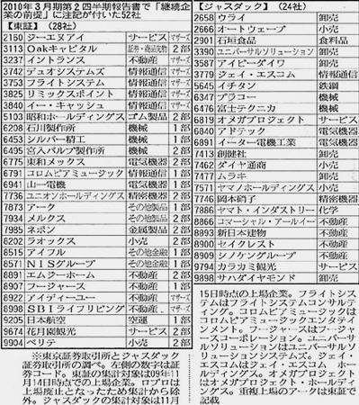 3月決算企業のうち、2010年3月期第2四半期(09年7~9月)に経営上大きなリスクを抱えているとして「継続企業の前提」に注記が付いた上場企業(東証、ジャスダック)が計52社に上ったことが、両取引所の集計で分かった。世界的な不況を受けて、企業の監査ルールは09年3月期以降、大幅に緩和されているが、それでも「イエローカード企業」は高水準で推移している。 会計ルールにより、上場企業の経営者は自分の会社に経営を続けていく上で重大なリスクを抱えていると判断したら、リスクの中身と対応策を決算書などに明記しなくてはいけない。 また、経営をチェックする監査人も、担当企業に重大リスクが存在すると判断した場合、監査報告書に注意を促すための「注記」を記載する。投資家にとって注記は、監査人が認めた「イエローカード企業」という意味合いがある。 興味のある方は、"つづきはこちらです"をクリック!