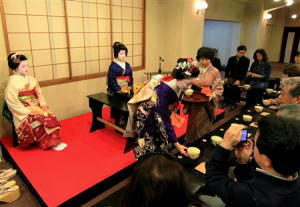 冬は京都観光のオフシーズンで、せっかく祇園に来ても何もないでは…と、京都伝統伎芸振興財団が初めて企画した。 ひと目で花街のことがわかるギオンコーナーは外国人観光客に人気が高い。このパーティーでも半数が外国人ということで、パーティーの形式はいすに腰かけて行う「立礼式(りゅうれいしき)」。明治5(1872)年に初めて開催された「都をどり」で裏千家11世、玄々斎千宗室が創設したという、いかにも祇園らしいもてなし方だ。 楽屋裏で楽しく笑いながら世間話などをしていた3人だが、本番では洗練された所作で客を魅了する。すべての動きに一本の筋が通った真織さんが2人の舞妓の動きをうかがいながらお点前を披露し、あどけなさが残る中にもほのかな色気を感じる真ひろさんと真希乃さんが茶碗を手に客の前を通る。 こうなると会場は非日常の世界。客はこのひとときを収めようとカメラのシャッターを切り、ビデオ撮影をする。特に外国からの客は日本の伝統文化の粋を集めた京都の中でもさらにディープな、これまで体験したことのない時間を過ごすことができたのでは。 祇園というと、「一見さんお断り」の一言が有名で、何かお客を拒絶しているかのような印象に受け取られがちだが、これはなじみの客を最高にもてなしたいがためのこと。 記念撮影を含みわずか30分ほどの時間だが、最高のもてなしの一端を感じたい人は13日から2月24日まで毎週月、水、金曜日の午後2時、3時、4時にギオンコーナーまで。料金500円。(園田和洋) ■□━━━━・・・・・‥‥‥……………………………… 2月は、 8日(月曜日) 各日3回(14:00~、15:00~、16:00~) ※各30分間。 ■イベント詳細■ ◆会場 ギオンコーナー ◆住所 京都市東山区花見小路四条下ル ヤサカ会館内 ◆交通 JR「京都駅」より ◆料金 500円(先着順/整理券発行) ◆お問合せ先 ギオンコーナー 075-561-1119 ◆ホームページ (おおきに財団) http://www.ookinizaidan.com/ PR |