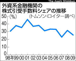 ESPは「日本市場はもうからないと評価している外資系が多い」と説明。景気が回復した後も外資系が増やす雇用は2千人程度とみる。 英HSBCは昨年8月、日本株の調査・運用機能を香港に統合。関係者によると、担当部門の40~50人をリストラしたという。欧州系金融機関の幹部は「日本の収益規模はピーク時の半分以下。日本の人員を減らし、その分をアジアの新興国に振り向ける動きが目立ってきた」と漏らす。 外資系金融機関は90年代、世界2位の時価総額の東京株式市場に注目して日本拠点を拡充。97年に自主廃業した山一証券などの社員を吸収する受け皿にもなってきた。外資系証券会社には邦銀大手から移った社員も多い。 しかし、トムソン・ロイターがまとめた98年以降の外資系証券の株式引受手数料シェアの推移を見ると、01年の45.8%をピークに下がり始め09年は25.7%。「アジア市場などに乗り換える外国人投資家の動きに合わせ、外資系が日本での営業力を落としてきた表れ」との見方も多い。 ESPの小溝勝信代表は「外資系金融機関は海外ネットワークを駆使して日本企業の資金調達や海外進出、個人の資産運用を支援してきた。外資系の『日本離れ』は、日本にとってマイナスが大きい」と話す。(都留悦史) 【関連記事】 ■□━━━━・・・・・‥‥‥……………………………… バブルが弾けて下り坂・・・って状態なら、上記記事は正直、 そろそろ、こう言ったスピーカー記事から卒業したいものです。 ・・・っていうか、なぜ日本のマスコミは日本人の為の記事を