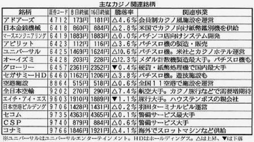 株式市場でにわかに、「カジノ銘柄」が注目され始めている。超党派の国会議員が今週、「国際観光産業振興議員連盟」(通称・カジノ議連)を結成。国内開設に現実味が出てきたためだ。実現すれば、巨額のマネーが動くだけに、マーケットでもホットな話題になっている。 カジノ関連銘柄が注目され始めたのは、先週末の9日。産経新聞朝刊がこの日、カジノ議連結成と、カジノ合法化法案の秋の臨時国会提出方針を報じたためだ。 開設の候補地としては本命に東京・お台場と沖縄北部、対抗に北海道が浮上している。 興味のある方は、"つづきはこちらです"をクリック!