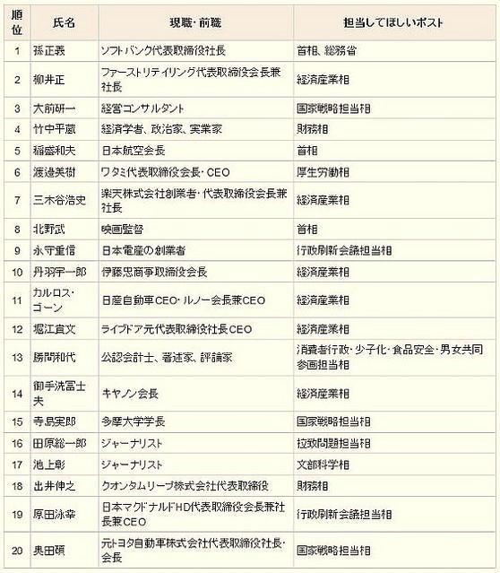 既成概念にとらわれることなく、軽いフットワークで不可能を可能にしていく孫氏。決断力と強いリーダーシップを政界でも発揮して欲しいという想いが反映された結果になっているようです。Twitterでは約40万人のフォロワーを集め、その率直な発言はニュースにもなるなど話題となっています。 Twitterではお馴染みとなった、孫氏の「やりましょう」発言を、政界で聞ける日は来るのでしょうか! ■2位は経済産業相に柳井氏 田舎の小さな商店を世界規模のアパレル企業にまで成長させた柳井氏。アパレル業界の常識を塗り替えるだけでなく、海外にも積極的に出店して成功を収めているその手腕が評価されたようです。 ■3位は国家戦略担当相に大前氏 世界的に有名な経営コンサルタントであり、マレーシアの国家アドバイザーも務めた大前氏。著書の中でたびたび「日本立て直しプラン」の提言も行なっていることから、戦略担当として期待を集めているようです。