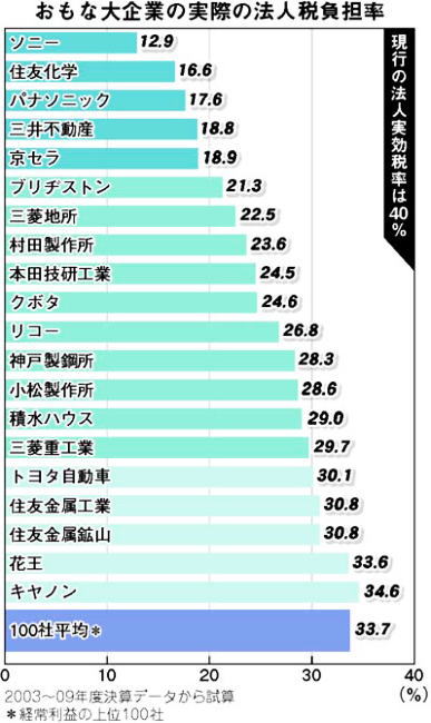 平均3割 試算は大企業に対する優遇税制が一段と強まった2003年度から09年度の7年間を対象にしています。経常利益の上位100社(単体)で負担率は平均33・7%でした。 財界は法人税の実効税率を25%に引き下げるよう政府に要求していますが、日本経団連の会長企業、住友化学が払っている法人課税の負担率はわずか16・6%でした。前会長の企業、キヤノンは34・6%です。 自動車メーカーでは最大手のトヨタ自動車が30・1%、本田技研工業は24・5%でした。電機ではパナソニックが17・6%、ソニーが12・9%。鳩山由紀夫前首相が大量の株式を保有していたブリヂストンは21・3%でした。 大企業は研究開発減税で大幅な恩恵を受けるほか、海外進出を進めている多国籍企業には外国税額控除などの優遇措置があり、40%の税率は骨抜きにされています。 法人実効税率は国税である法人税に地方税である法人住民税、法人事業税を加えた税率です。この試算では、景気変動の影響を除くため各社の決算データから7年間の税引前当期純利益と法人3税の合計額で実際の負担率を計算しました。銀行・証券・保険業と純粋持ち株会社は除きました。