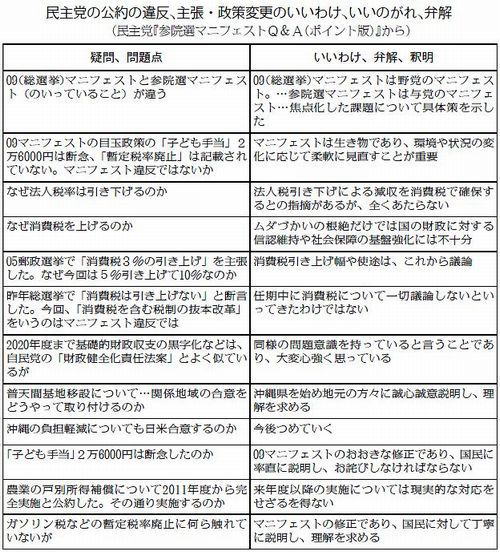 民主党は今回の参院選で、消費税増税をはじめ昨年の総選挙で国民に約束した公約に反する政策を掲げたことから、いいわけ、いい逃れ、弁解、釈明を集めた内部資料を作成し、衆参国会議員、参院選候補者へ配布しています。 問題の内部資料は『参院選マニフェストQ&A(ポイント版)』で67ページ。「民主党は総選挙で『消費税は引き上げない』と断言してきた。今回『消費税を含む税制の抜本改革』を掲げることは、マニフェスト違反ではないのか」、「『子ども手当』2万6000円を断念し、『暫定税率廃止』は記載もしていない。明確なマニフェスト違反ではないか」など消費税関連の16問を含む61項目の疑問や質問に答えるかたちで民主党の立場を説明しています。 菅直人首相・代表になった民主党は従来の民主党の公約や基本政策を次々転換・変更し、有権者の批判を招いていることから、党執行部の指示で急きょ、用意されました。 ただ、別表のように、総選挙公約を次々とひるがえし、消費税増税のように公約に真っ向から反する政策を打ち出していることについて開き直り、いいわけ、弁解に終始しています。 公約違反の指摘には「マニフェストは生き物であり、…柔軟に見直すことも重要」、予算編成で歴代自民党政権の大枠を変えられなかったことには「1回の予算編成でできるものではない」、消費税増税には「消費税について一切論議しないといってきたわけではない」など強弁しています。 「なぜ法人税率を引き下げるのか」では、日本共産党の批判を意識して、「法人税引き下げによる減収を消費税で確保するとの指摘があるが」と反問。しかし、なんの根拠も示すことができないまま「全くあたらない」と答えています。 「こんな言い訳を聞かされた有権者は、ますます怒るだろう」との声が民主党内で聞かれます。 PR |