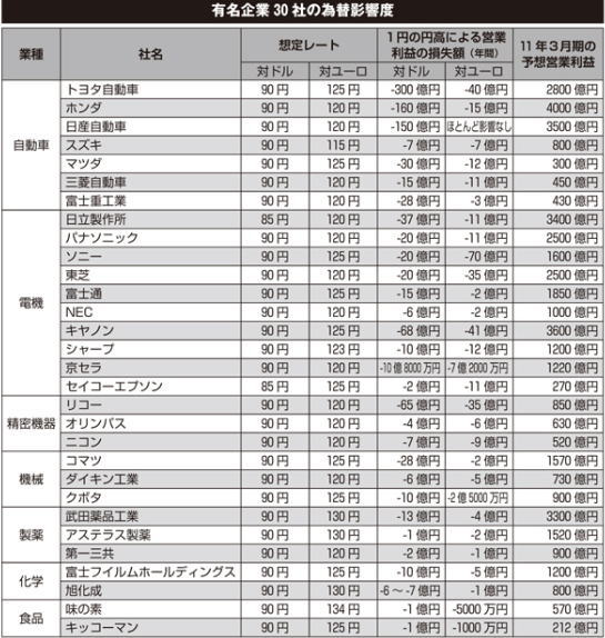 この円高に対して、各企業は、冒頭のように危機感を強めている。というのも、円高は、海外で売り上げ拡大を図る日本企業に大ダメージを与えるからだ。証券アナリストの植木靖男氏はこう話す。 「海外に進出した企業は、製品を海外で売った代金をドルやユーロで受け取り、それを円に換えることになります。円安の場合は、外貨を交換した時に多くの円を受け取ります。 そこで本誌は、海外進出する主要企業が円高でどのくらいの損失を被るのかを調査。それをまとめたのが次ページの表だ。植木氏の言う"損失"を示すのが、表の中央列にある「1円の円高による営業利益の損失額」だ。 これは、1円円高になった場合に、営業利益がどのくらいマイナスになるかを年間ベースで試算したもの。表中にある各数値は、企業各社が '10年3月期決算で公表した数字である。前出・植木氏が解説する。 「円高で企業業績に悪影響が及ぶ業界は、主に自動車と電機です。ただ、対ドルで円高になるのと、対ユーロで円高になるのでは、企業にとって、影響の度合いが変わります。対ドルで円高になった場合、大きな影響を受けるのはトヨタ自動車。 損失額は莫大なものになる。トヨタ自動車の場合、1円の円高で約300億円なので、5円の円高では営業利益で約1500億円の損失が生じる。すると、予想営業利益の2800億円が半分になってしまうのだ。一方、ソニーの場合、対ユーロで10円の円高になると約700億円が消える。 また、円高1円による損失額が小さくても、営業利益が少なければ相対的なダメージは大きくなる。マツダは、対ドルで約30億、対ユーロで約12億円の損失額だが、予想営業利益が300億円と少ないため、仮に対ドルで5円、対ユーロで10円の円高になれば、営業利益の約9割が吹き飛んでしまうのである。