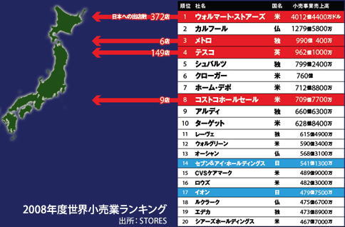 北海道で、九州で、山梨で、地方の地場スーパーがヨーカ堂やイオンを蹴散らし、彼らは撤退を余儀なくされる、という事態に見舞われるようになっていたのです。地方流通業を大手流通が蹂躙するというのは、幻想でした。むしろ真実は逆だったのです。 地方スーパーどころではありません。 もっと恐ろしい、巨大な影がヨーカ堂とイオンを襲います。 首都圏をぐるりと回る国道16号線。横浜、橋本、町田、埼玉・入間、新三郷、幕張・・・・・・。これらの郊外でいま、圧倒的な人気を誇っているのが、コストコホールセール。アメリカからやってきた、巨大流通業の店頭に、毎日毎週自動車で来店したファミリーが次々と吸い込まれていきます。 コストコだけではなく、テスコ、メトロといった欧州系の巨大流通も2000年代に入って以来、次々と店舗数を増やしています。 さらにオセロをひっくり返すようにいきなり372店舗を展開する巨大流通業があります。世界最強のウォルマート・ストアーズです。なぜそんなことができるかって? 先ほど書きましたね。西友はもはや事実上ウォルマート・ストアーズなのです。 日本の誇るGMSの最後の両雄、イトーヨーカ堂とイオンは今、上と下から猛烈な勢いで市場を奪われています。下とは、地場の優良スーパー。上とは、世界トップクラスの多国籍流通業。 でもこんな話を聞いたことがありませんか? 日本の消費者は世界一。ゆえに、弱小スーパーのバイイングパワーでは品揃えと安値を両立した店頭は作れないし、海外からやってきたがさつな巨大流通では、日本の繊細な消費者のニーズにあった棚はつくれない。だからヨーカ堂やイオンが強かったはずだ。 たしかにそうでした。1990年代までは。 国内GMSはスケールメリットを生かして、大量仕入れを行い、データベースを駆使して、ムダなのない棚作りを行い、利益率の高い店頭を構築しました。スケール面で劣る地場スーパーも、日本人のニーズにあった品揃えができない外資にも、負けることはありませんでした。 じゃあ、なぜいまヨーカ堂とイオンが危機なのでしょう? なぜ地場スーパーに蹴散らされ、海外からやってきた巨大資本に市場を奪われるようになってしまったのでしょう? ヒントを3つほど並べておきます。 (1)グローバルカンパニーじゃなきゃ、できないことがある。 (2)生鮮食料品の仕入れが死命を決した。 (3)魅力的な店頭は、もはや流通業1社ではつくれない。 以上です。答えを知りたい方は、今週の日経ビジネスの特集に余すところなく描かれています。ぜひ、本誌をお読みください。 ■□━━━━・・・・・‥‥‥……………………………… イトーヨーカ堂=セブン&アイHD 流通業の方々も、よくワタシのブログへ立ち寄って頂いていますので、 「<3382>セブン&アイHD」も「<8267>イオン」も、 店子の賃料で稼いでいる「賃貸不動産業」でしょう。 だから儲けを増やそうとすると、どうしても次から次へと 結果、どうなるか???・・・は、判る話ですよねぇ~・・・・・ なので、地元スーパーが強いのです。 店子の賃料を幾らにするか???・・・で、クーラーの効いたオフィスで まぁ~あと5年もすれば見事なまでに結果が出るんじゃないですか!?