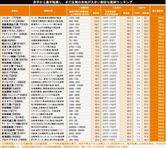 「今年度は1Qよりも2Q、2Qよりも3Qと、業績の回復が見込まれていました。実際、期初の業績予想よりも上方修正した企業は、1002社にも上っています」というのは、前出の本吉亮氏。それなら、この中から業績回復が鮮明で、まだ上がりそうで、これから買ってもいい銘柄を知りたい! 「スクリーニングの方法は3つの視点。1つ目は上方修正の大きさですが、上方修正の額が株価に与えるインパクトを見なければなりません。『10億円の上方修正』といっても、大企業にとってはほとんど影響ありませんが、中小企業の株価にはインパクト大ですよね。そこで、時価総額に対する上方修正の額を計算し偏差値化したのが、『①増額修正』の欄です」 ただ、すでに株価が上がりきっていては困りもの……。 「そこで、昨年来安値と比べ、まだあまり反発していないかどうかが2つ目の視点で、『②反発力』の欄。ドリコムのように、10か月で11倍になってしまった銘柄もあります。このような銘柄をこれから買うよりは、まだ上がる余地が大きい銘柄のほうが安心でしょう。業績の回復は確かなのですから。そして、PBRやPERなどで『③割安性』も勘案しました」 最後に①~③の偏差値から総合偏差値を算出し、1002社をランキング。これだけでも有望銘柄に違いないのだろうが、本吉氏は「なかでも赤字予想から黒字転換する銘柄は、特に期待できるでしょう」と指摘。確かに、最高益を更新し続ける企業は魅力的だが、底入れし業績が戻るとき、株価は最もダイナミックに動くもの。1002社のランキングのなかから“黒転”の上位39社が下の表で、「もう赤字にはならないだろう」と自信を覗かせる企業だ。 PR |