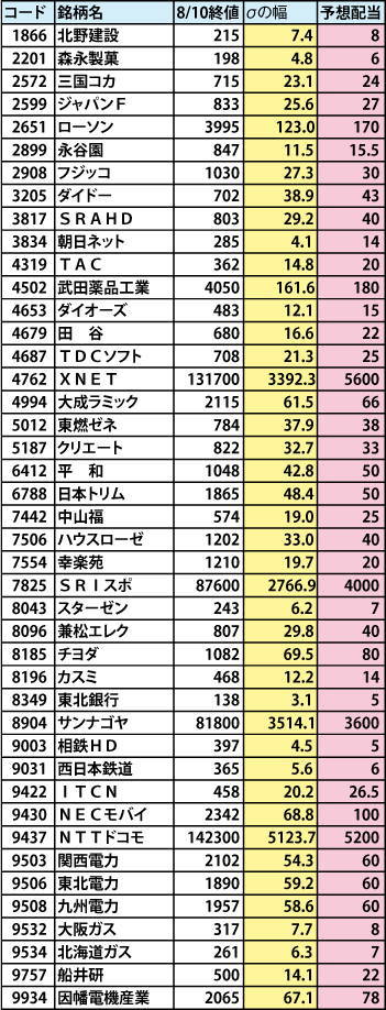 もはや日本株で儲けるとなると八方塞がり、手の打ちようが無いといった雰囲気もあるが、そのなかで数少ない儲けのチャンスを見つけてくるのがプロである。 実際、日本株を売られ過ぎと感じて本格的に押し目を買おうと考えているファンド、上場企業オーナーなどの富裕層は多くなっているとも聞く。 今の相場での投資の考え方として、ある市場参加者から興味深い話が聞けたので、今回はそれを紹介したい。というか、いろいろ聞くなかで、「なるほど」と思ったのはこの考え方くらいだったのだが…。 投資の成功の近道は、勝率を高めること。利益も損失も同額なら、10勝9敗でも勝ちである(トレードコストで負けることもあるが…)。この勝率で、理屈上68%の勝率を期待できる投資手法が今の状況においてもあるそうだ。期間は1年程度を想定、いわゆる「長期」に入る部類の投資である。 この勝率の高い投資機会に気付いた市場参加者は、「標準偏差1(σ)の幅と今期の予想配当金が同等といった銘柄がかなり多くなっている」と指摘する。これだけではピンと来ないかもしれないが、標準偏差1というのは、この値幅のなかに株価が68%の確率で収まるという意味(ここでは標準偏差の細かい説明は省く)だ。 配当の権利を取ることを考えると、ベースとするラインを12ヶ月移動平均線(月足の12本の移動平均値)に設定して標準偏差を計算してみたい。これを東証1部に上場する全銘柄を対象に実施したところ、標準偏差1の値幅より、予想配当金のほうが大きい銘柄が43銘柄あった。つまり、この43銘柄については、「今買っていれば、仮に1σほど株価が下落しても、配当分を考慮すれば68%の確率で儲かる」というわけだ。 その銘柄のリストは以下の通り。 ディフェンシブ系の代表格である電力、ガス、その他ではNTTドコモや武田薬品などの大型株も含まれている。例えばNTTドコモでいえば、5120円程度の上下値幅に収まる可能性が68%である一方、配当5200円はほぼ確実にもらえるという意味である。 「生き馬の目を抜く」ということわざがあるが、まさにこういったマーケットに転がっているチャンスを目ざとく発見し、それにベットできる投資家が生き抜いていくのだと思われる。ダメダメ感たっぷりの日本株市場だが、ここで腐らず頑張っていただきたい。 PR |