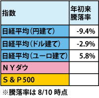 日本人すら買わない日本株だが、頼みの綱である外国人投資家はどうだろうか。実は日本の指数は世界的に見てかなり出遅れている。 当然日本人は円で日経平均を見るわけで、円建ての日経平均が欧米の主要株価指数と比べてパフォーマンスが悪いことは一目瞭然である。この日本株と世界の株式市場のパフォーマンス差を鑑みて、「ジャパン、割安デスネ」と買ってくれるような外国人投資家はいるのだろうか? ここで外国人投資家の目線に視点を変え、先ほどの年初来の騰落率を見てみたい。 これを見ると、「ジャパン、割安デスネ」を期待するのはきびしいことがお分かりだろう。外国人投資家は当然ながら本国の通過で日本株を管理している。つまり、米国の投資家であれば、ドル建てで日本株を管理しているわけだ。 東証における外国人のシェアは約6割といわれており、どちらかといえば円建てよりドル建てなどでパフォーマンスを見なければ、外国人投資家との理解の不一致を招いてしまうわけである。今の日本株市場の状況を外国人投資家目線でいえば、「円高の進行による円資産の価値の上昇で、それほどパフォーマンスが悪くはない」のだ。利益確定といったノリで、この低水準から外国人が売ったとしても何らおかしくはないのである。