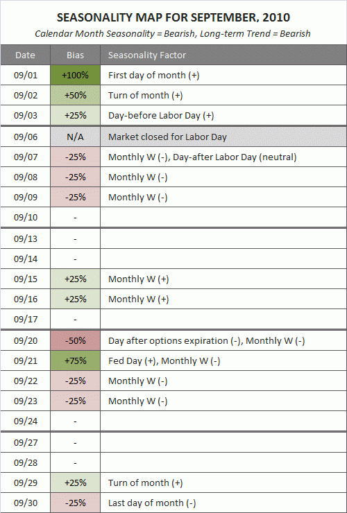 Seasonality Map for September, 2010 About the Monthly Seasonality Map One of the unexpected side effects of keeping this blog is I’ve become a proponent of seasonality (i.e. bullish/bearish biases around certain times of the month, year, etc). This seasonality map forces me to tie my seasonality studies together every month and is even being used in our own proprietary strategies (read how). The studies included are: (a) the turn of the month, (b) the first and last day of the month, (c) the day-after options expiration, (d) the monthly W, (e) individual holidays, (f) scheduled Fed meetings, and (g) strong/weak calendar months. To be clear, I do NOT think that seasonality alone is sufficient to justify a trade; however, all of the seasonality plays included in this report have been consistent enough that I do think they should be one of many tools in the trader’s toolbox. Some observations have been stronger than others, so I’ve rated the strength of each from -100% (most bearish) to +100% (most bullish). Very low ratings (+/- 25%) indicate the play has been very inconsistent and needs to be viewed with an extra skeptical eye. This is a constantly evolving work and reader input is always appreciated. Happy Trading, 興味のある方は、"つづきはこちらです"をクリック!