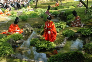 曲水の宴(きょくすいのうたげ)は、平安時代の優雅な貴族の文化を この行事は、城南宮のすぐ近くにあったという鳥羽離宮で、 会場となる楽水苑は鳥羽離宮の庭園の遺構で、 四季それぞれにあった庭と御殿を造って渡殿(渡り廊下)でつなぎ、