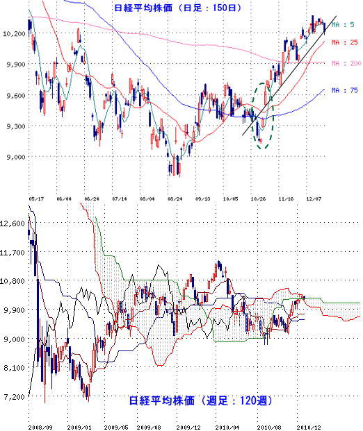 ▼上値抵抗▼ 10216.41 12月20日 終値 (-87.42円) △下値支持△ 10137.86 一目均衡表・週足雲の上限
