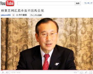次の広島市長選(3月27日告示)に出馬せず、3期目の今期限りで退任する意向を表明した秋葉忠利市長(68)がインターネットの動画投稿サイト「YouTube(ユーチューブ)」に退任理由などを説明する映像を投稿していたことが6日、分かった。秋葉市長は市政記者クラブの会見要請は拒否しており、市民からは「ネットを見られない人への説明責任を果たしていない」と批判の声が上がっている。 映像は「秋葉忠利広島市長不出馬会見」の題で、14分50秒。スーツ姿の秋葉市長が「若く想像力に満ちあふれた方に、たすきを受け継いでもらいたい」などと語っている。 退任を決めた心境については、正月休みに家族で箱根駅伝をテレビ観戦したことにふれ「たすきをつなぐ大切さが心に響いた。次の選手につなぐことですばらしい成果があがる。これが潮時かと、目からうろこが落ちる感覚だった」と説明した。 秋葉市長は昨年来、定例会見で次期市長選への態度を質問された際にも「市長としての会見で選挙について答えるのはそぐわない」などと話していた。退任を表明したのは今月4日の市の仕事始め式。式後は報道各社の質問に答えないまま会場を後にした。 秋葉忠利・広島市長の単独インタビュー 興味のある方は、"つづきはこちらです"をクリック!