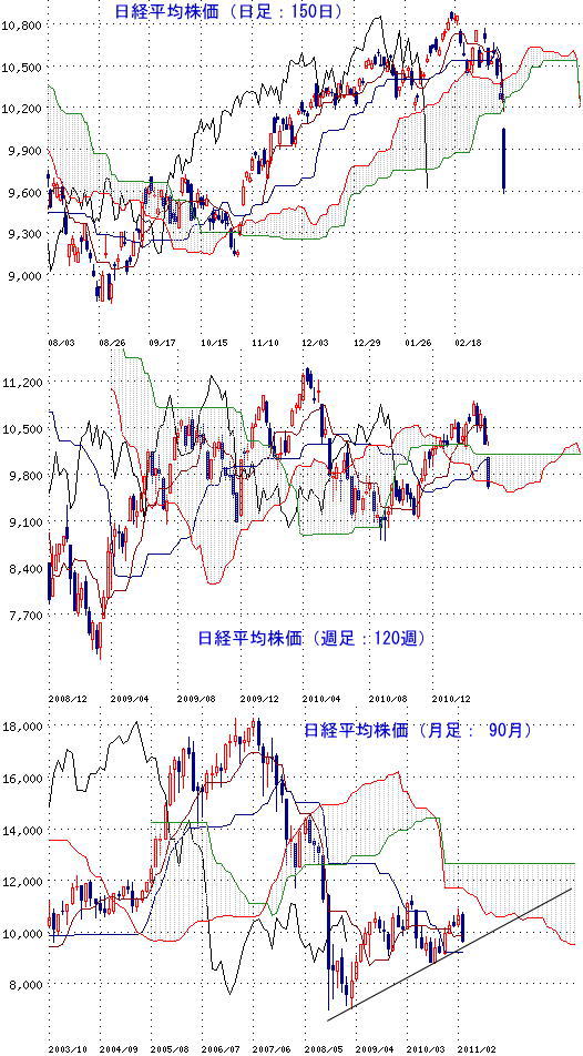 本当は週足チャートの雲で留まりたかったのでしょうが、 ここまで急落した現在でもまだ全体相場的・・・・・ 弱気になってはいけません。ここは強気なのです。 明日は、 日銀の大規模な危機対応を評価、円高進めば追加緩和余地も ・・・や、 「震災復興基金」「震災復興事業」等の思惑から