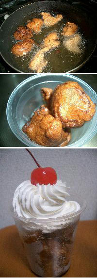 材料のストロベリー味のシロップは入手できたのですが、コーラ味シロップは コーラ味だけじゃ、味がイマイチだったのか? 何でストロベリーのシロップ、 そして丸めた生地を油で揚げます。見た目はドーナツというより さて、お味は。ド素人が作ったので生地の食感は悪いのですが、 そして、やっぱ揚げ物にはコーラでしょと、「フライドコーラ」を食べながら この「フライドコーラ」、実はまだお店では販売されていないらしい ・・・っと言うことで、試したい奇特な人は、どうぞお試しあれぇ~!!