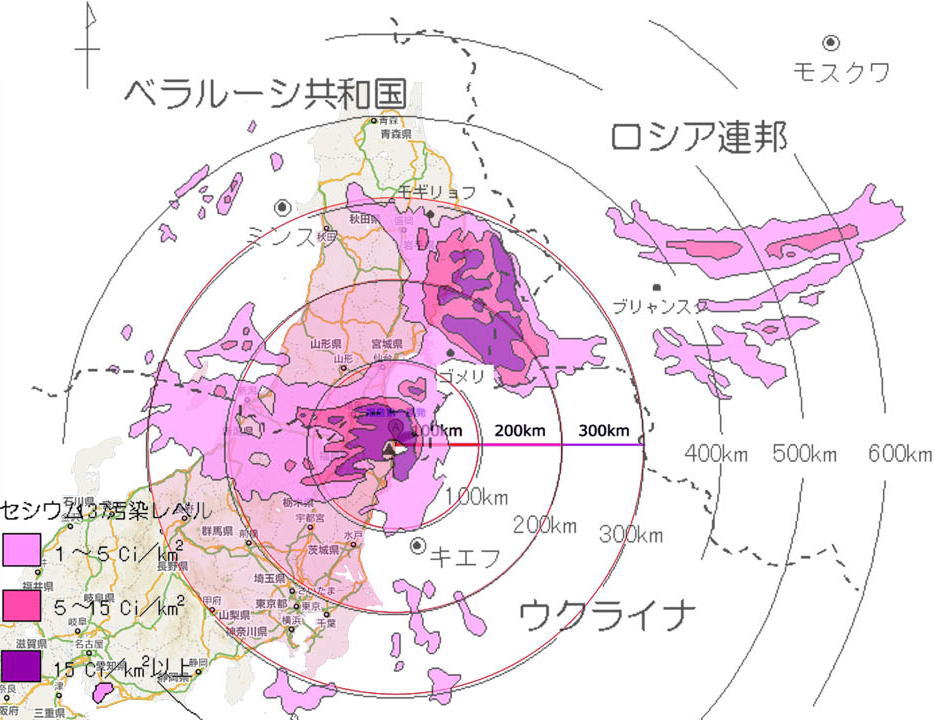 東北地方の日本地図にチェルノブイリの被害図を重ねた地図