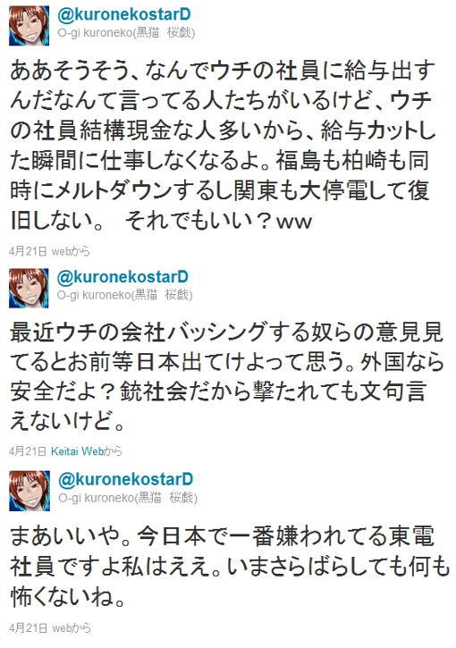 東電は3月31日付で、資材部長名の文書を業者らに配った。この文書によると、福島第一原発(福島県)、福島第二原発(同)、東通原発(青森県、建設中)で、地震発生前に契約の手続きをした、原発敷地内の様々な施設の工事や業務委託、原発の運営に使う様々な物品の購入が、契約解除や支払い保留の対象としている。福島第一に関する契約では、工事が完了した際の検査や、物品を納入する際の確認にあたる「検収」が、地震で困難になった工事や物品購入について、契約の解除に向けた協議をするとしている。 福島第二と東通では、工事や物品の納入を一時中止し、完成した工事の検査や、物品納入の際の検収、代金の支払いを保留するという。 福島県内の業者は2月、代理店を通じて福島第一に資材を納入した。通常は3月末に東電から代理店に代金が支払われるが、地震後の混乱で、3月は入金されなかった。このため4月末まで待ち、あらためて代理店に支払いを求めると、資材部長名の文書を渡された。代理店側は業者に対し、東電側から入金がなく、代金を払えないと説明したという。 この業者は「東電が確実に支払わないと、業者の連鎖倒産が起きかねない。東電はきちんと契約を履行すべきだ」と憤った。 東京電力広報部によると、2月に物品が納入された場合、通常は3月上旬までに伝票の処理などを終え、3月末までに支払う。「発電所が被災し、放射線で立ち入りも困難な状況で、支払いが滞っている取引はある」としている。 一方、福島第一の復旧作業に社員らを派遣している福島県内の建設業者は地震の後、復旧作業について、あらためて東電側と契約した。この業者側の関係者は「契約書は交わしたが、きちんと支払われるのか心配だ。入金がないと従業員の給料も払えず、危険な作業も続けられない」と話す。 ■□━━━━・・・・・‥‥‥……………………………… 東電、夏のボーナス半減 1カ月分で40万1000円か 東京電力が一般職員のこの夏のボーナス支給額を1カ月分とすることで労使が妥結したことが分かった。(夕刊フジ) 平均支給額(組合員平均38・2歳)は交渉ベースの40万1000円とみられる。同社の昨夏の平均支給額は83万6000円のため、半額以下となる見込みだ。 支給額について同社は「福島第1原発事故で被災されたみなさまへの補償や設備復旧等にかかる諸経費の増加による経営状況の大幅な悪化等を踏まえて決定した」と説明している。 福島第1原発の被災者への賠償に対応するには国などの支援が不可避だが、東電は前提として徹底したリストラを迫られている。 すでに役員報酬の50%カットや保有資産の売却、新卒採用の見送りなどの方針を決めている。一般職員についても年収20%カットを実施する方針だが、早速夏のボーナスに反映された形だ。 ただ、原発事故の収束はいまだめどが立たず、賠償額も判明していない。状況次第では今後、さらなるボーナス削減を迫られる恐れも残る。 ■□━━━━・・・・・‥‥‥……………………………… 東京電力は、東京電力職員のこの夏のボーナスを、今年ももれなく支給します。 ですが・・・・・・・ 福島原発で、放射能汚染されている所で作業されている ・・・ということだそうです。 あぁ~ちなみに、東電社員 曰く・・・・・ 東電社員 「給料カットされるなら俺たち働かないぜ。 ああそうそう、なんでウチの社員に給与出すんだなんて言ってる人たちがいるけど、ウチの社員結構現金な人多いから、給与カットした瞬間に仕事しなくなるよ。 ・・・・・なぁ~んて、電力社員がTwitterで宣っていますが・・・・・ PR |