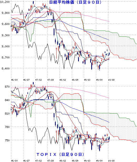 20日の東京株式市場は、上値の重い展開か。19日の東京市場は相変わらず薄商いで、取引時間中の値幅も9営業日連続で100円未満となった。上昇と下落を繰り返しており、方向感も定まっていない。日経平均株価、TOPIXとも、一目均衡表では、分厚い「雲」が下へ流れ込んでおり、まもなく下限に接近する格好だ。今晩の米国市場で、アップルの決算が重しになることは織り込み済み。ただ、買い上がる材料も乏しい。きっかけがつかめないまま、はっきりしない展開が続くようだと、「雲」に上値を抑えられる可能性が高まる。 PR |