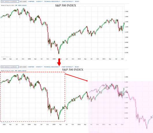 遊びでS&P500の週足と、リーマンショック前のチャートを重ねてみました。