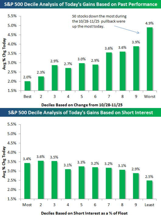 The average stock in the S&P 500 rose 3.17% yesterday. Throughout the day and after the bell, all the talk was that it was nothing but a short covering rally. In reality, it was a more of a loser's bounce than anything. In the first chart below, we have broken the S&P 500 into deciles (10 groups of 50 stocks each) based on stock performance from the 10/28 market high through last Friday's close. We then calculate the average performance yesterday for the stocks in each decile. As shown, the 50 stocks that were down the most during the 10/28-11/25 pullback averaged a gain of 4.9% yesterday, which was by far the best performing decile. The 50 stocks that held up the best from 10/28-11/25 were only up an average of 2% yesterday. In the second chart, we have broken the S&P 500 into deciles based on a stock's short interest as a percentage of float. Using the same scale on the y-axis as we did for the first chart, the decile performance hardly stands out. The most heavily shorted stocks did outperform the least heavily shorted stocks yesterday, but the difference was minimal compared to the best and worst deciles in the first chart. (二つ目のチャートにおいて、我々は空売りポジションの割合いに基づきS&P500株を10分割した。最初のチャートで用いたのと同じ目盛りをY軸に使用しているが、各グループの成績に顕著な差を見つける事は困難である。昨日の取引において、最も大きく空売りされていたグループは最も空売りの少なかったグループの成績を上回っているものの、その差は、最初のチャートに示された最高と最低のグループの差に比べると非常に小さい。)