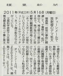 「チェーンメールで放射線のデマ拡大」 福島第一原発の事故に関連して、千葉県の柏、松戸、流山と、埼玉県の三郷の計4市で、飛び地のように放射線の観測値が高くなる「ホットスポット」が発生しているといううわさがチェーンメールやツイッター、ネット掲示板などで広がっている。