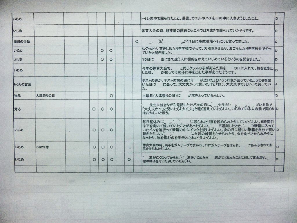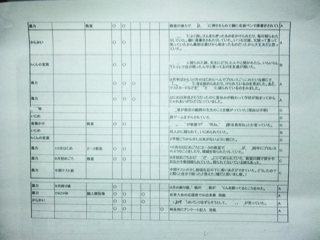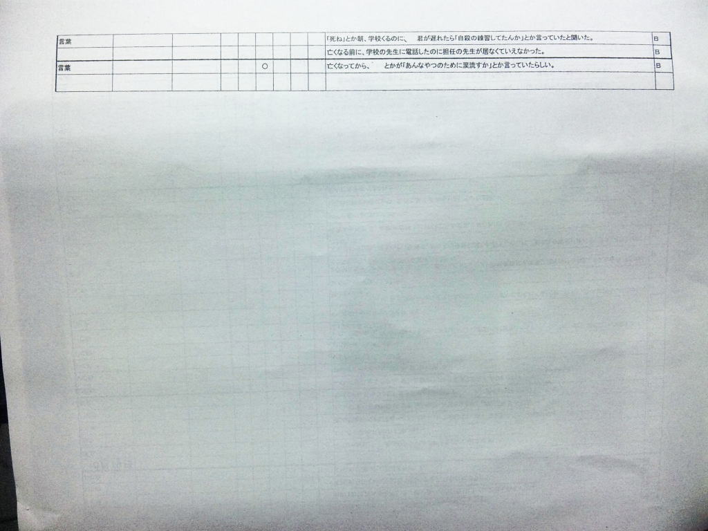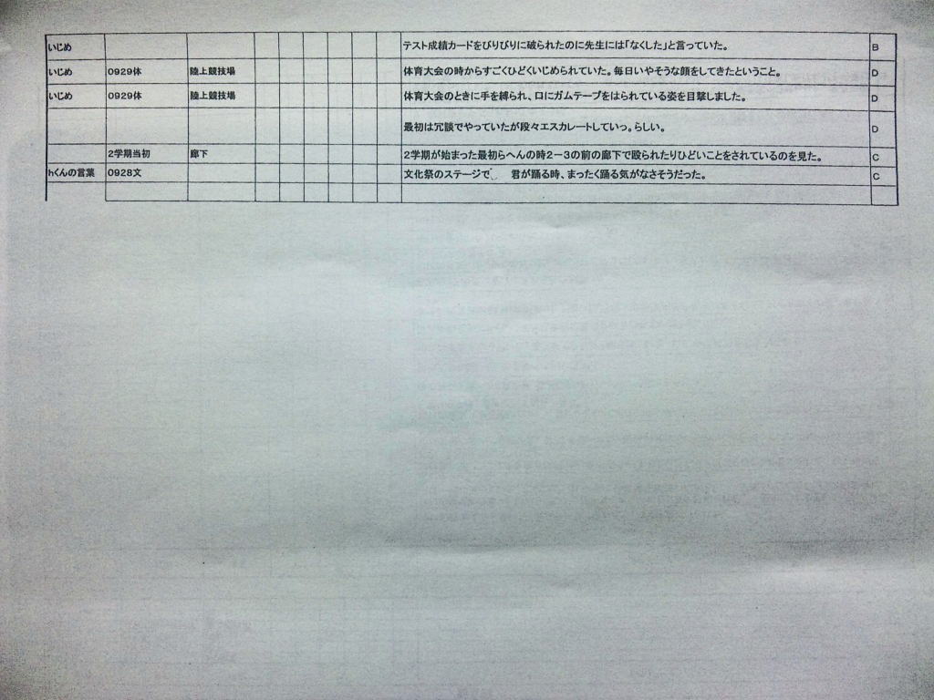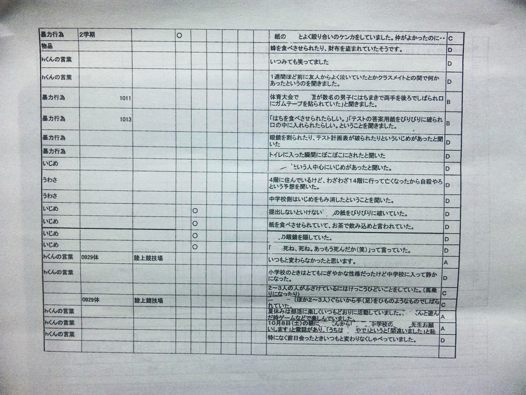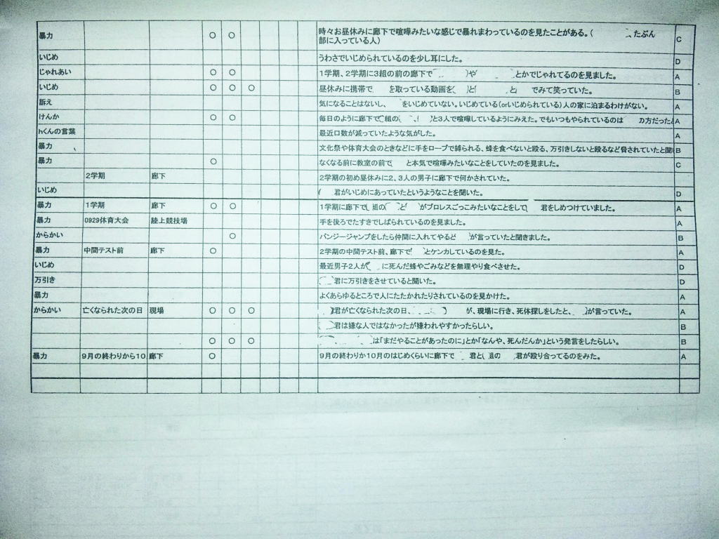 ◆エピローグ◆ その後、同級生の立場で誠をいじめていた和彦は、誠の幻影に怯え続け、発狂する。留加は昏睡状態を脱したものの、重度の記憶障害に陥っていた。 担任の森田は、全校集会で生徒を前にして言う。すべての人が誠を殺したということ。他者を傷つけることで生きている実感を持とうとしているのではないかということ。そして、自分を愛するように他者も愛して欲しいということを。だが、他の教師らは無責任にも聞くなと言わぬばかりに生徒を退場させ、少数の生徒しか残らなかった。拍手で森田の意見に賛同するその中には、誠らしき姿もあった。焼け石に水かつ学校側は最後まで隠蔽体質を貫こうとしたというのになぜか森田は新しい希望を胸に抱いていた。 人影の少ない駅のプラットホームにたたずむ新見。彼が何者かの手に押され線路に転落した直後、列車がプラットホームに進入した。