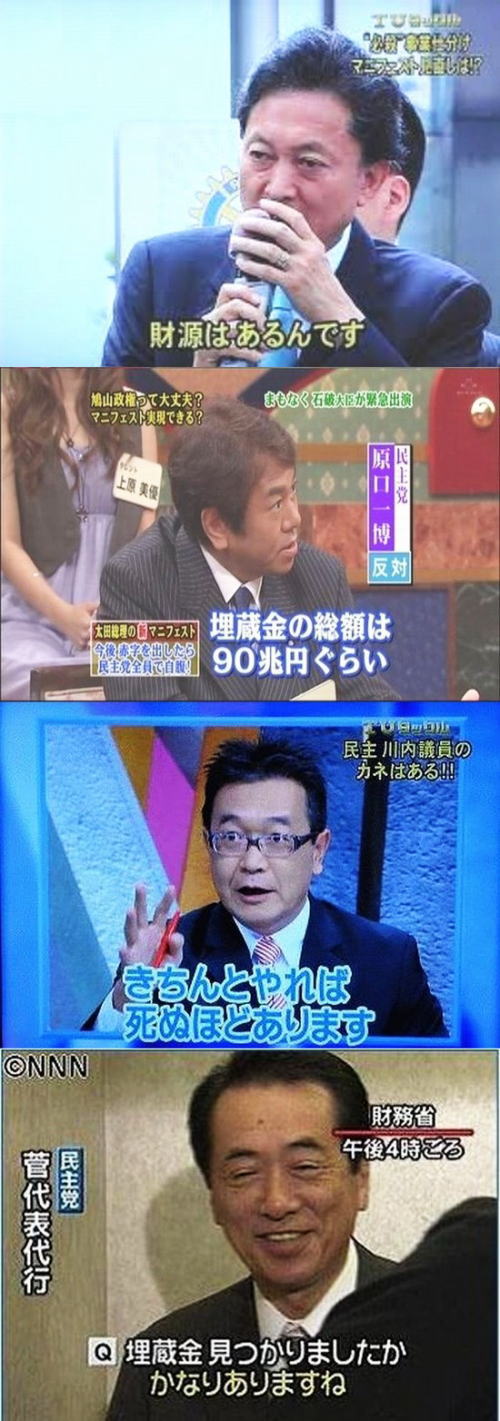 埋蔵金に関しては原口議員にいたってはテレビにでて、ちゃんと調べれば90兆円もの埋蔵金があるなどと大嘘をついて自民党を陥れた。