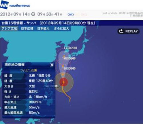 大型で猛烈な台風、北上=16号、週末沖縄大荒れ-気象庁 時事通信 2012/09/13-22:38 http://www.jiji.com/jc/c?g=soc_30&k=2012091300722