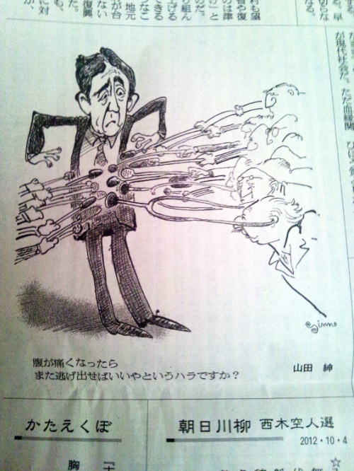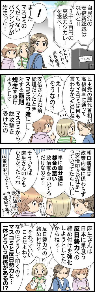 朝日新聞 2012/10/04の朝刊 安倍総裁「高級カレー報道」でスパイス効いたマスコミ批判!? 産経新聞 2012/10/05/ 06:36 http://sankei.jp.msn.com/politics/news/121005/stt12100506400002-n1.htm 「高級カツカレー」報道に“反撃”だ。自民党の安倍晋三総裁(58)は4日の記者会見で、9月26日の総裁選直前に「高級カツカレーを食べた」と一部マスコミが批判的に取り上げたことついて、直接的な批判は避けながらも皮肉っぽく言及した。 安倍総裁は若者の間でのネット情報の広がりについて触れたなかで「高級カツカレー問題」を引き合いに出した。 「(総裁選直前に食べた)カツカレーが3500円する高級品だと批判した新聞社の(ビルに入っているレストランの)カツカレーは5000円を超えているとネットで流れていた。時代は変わったと感じる」と、マスコミが発信していない情報でも広くネットで流れる現状について、笑いを交えながら話した。 興味のある方は、"つづきはこちらです"をクリック!