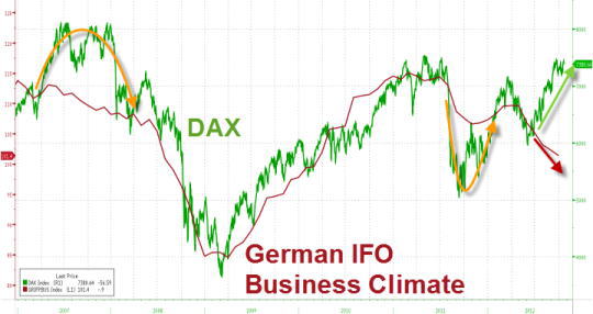”バーナンキ/ドラギが仕込んだ株式の底上げ”に基づくQE他の後の成績に対する失望で市場参加者達は考え込んでいるが、世界の株式市場にどれ程の希望があるかという事を理解する上で恐らくこれらの三つの図が助けになるだろう。 このマクロ的経済ファンダメンタルズからの乖離は珍しい事ではないが、過去においては重大で極端に急速な反動を引き起こしたのだ。 しかしそれは、正にアップル(AAPL)の様に、誰もが(自分以外の)全ての者達は大いに愚かしく、 - 今度は違うと信じているのだ。 ドイツの"DAX"は2007年の経済実態から(浮かれた側へ)乖離し、2011にも(夢から覚めた側へ)乖離した。 再び希望が席巻した様である...