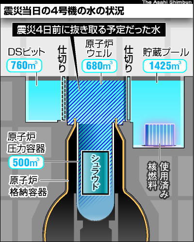 東京電力福島第一原発の事故で日米両政府が最悪の事態の引き金になると心配した4号機の使用済み核燃料の過熱・崩壊は、震災直前の工事の不手際と、意図しない仕切り壁のずれという二つの偶然もあって救われていたことが分かった。 4号機は一昨年11月から定期点検に入り、シュラウドと呼ばれる炉内の大型構造物の取り換え工事をしていた。1978年の営業運転開始以来初めての大工事だった。 工事は、原子炉真上の原子炉ウェルと呼ばれる部分と、放射能をおびた機器を水中に仮置きするDSピットに計1440立方メートルの水を張り、進められた。ふだんは水がない部分だ。 無用の被曝(ひばく)を避けるため、シュラウドは水の中で切断し、DSピットまで水中を移動。その後、次の作業のため、3月7日までにDSピット側に仕切りを立て、原子炉ウェルの水を抜く計画だった。 ところが、シュラウドを切断する工具を炉内に入れようとしたところ、工具を炉内に導く補助器具の寸法違いが判明。この器具の改造で工事が遅れ、震災のあった3月11日時点で水を張ったままにしていた。 4号機の使用済み核燃料プールは津波で電源が失われ、冷やせない事態に陥った。プールの水は燃料の崩壊熱で蒸発していた。 水が減って核燃料が露出し過熱すると、大量の放射線と放射性物質を放出。人は近づけなくなり、福島第一原発だけでなく、福島第二など近くの原発も次々と放棄。首都圏の住民も避難対象となる最悪の事態につながると恐れられていた。 しかし、実際には、燃料プールと隣の原子炉ウェルとの仕切り壁がずれて隙間ができ、ウェル側からプールに約1千トンの水が流れ込んだとみられることが後に分かった。さらに、3月20日からは外部からの放水でプールに水が入り、燃料はほぼ無事だった。