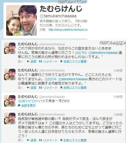 たむらけんじ、「狂った大人達に日本任せてたらもうダメ」…… 投票呼びかけたツイートが物議 RBB TODAY 2012年12月6日(木) 19時28分 http://www.rbbtoday.com/article/2012/12/06/98985.html お笑い芸人・たむらけんじが、6日に自身の公式Twitterで16日投開票の衆院選について、「狂った大人達に日本任せてたらもうダメ、若者の皆さん選挙に行こう!」と呼びかけたツイートがネット上で話題となっている。 たむらは6日、自身のTwitterを通じ、「自民党が単独過半数の勢い?! 自民がダメで民主、ほんで民主がダメで自民?! はぁ? この国の大人はどうかしてますね」とツイートした。 この前日の5日に、朝日新聞が全300小選挙区の有権者を対象に実施した情勢調査の結果を発表しており、「現時点で自民は小選挙区が好調で比例区と合わせ単独で過半数を確保する勢い」と報じている。たむらのツイートはこの調査結果を受けたものとみられる。続けてたむらは「こうなったら若者の皆さん僕たちの子供、孫たちのために立ち上がって選挙に行こう!狂った大人達に日本任せてたらもうダメ、若者の皆さん選挙に行こう!」と呼びかけた。 たむらとしては、支持する政党をひんぱんに変える有権者のポリシーを問い、投票を呼びかけることを本意とした発言だったようだが、特定の政党名を挙げたことで、たむらがそうした政党に投票しないよう呼びかけたようにとらえた一部のTwitterユーザーから反発する声が上がった。こうした声に対し、たむらは「なんで?選挙行こうゆうてるだけですやん。どこに入れろともゆうてませんよ」「これで何かゆわれるなら、なおさらこの国を変えないとあきませんね」と反論。そして、「頭の凝り固まった、既得権益まみれの人間ほど、やましい事がある人間ほど、大きな声でわめきちらすよ、他人の事を悪くゆうよ」と持論を展開するとともに、「みなさん、落ち着いて見極めましょう!今回は若い世代の人間が流れを決めれる選挙!選挙に行って新しい素敵な日本を手に入れよう!汚い大人を排除する為に選挙に行こう!」とツイートし、投票を呼びかけた。