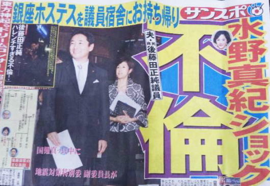 「婦唱夫随を地でいく後藤田・水野夫妻だが、水野がそこまで頑張るのには理由がある。夫・後藤田氏は、2011年6月に写真週刊誌で銀座ホステスとの“不倫写真”が報じられて以来、すっかり女性有権者の不興を買ってしまったのだ。」