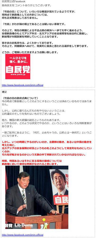 竹島の日、政府式典見送り 安倍氏方針 朝日新聞 2012/12/21/ 04:34 http://www.asahi.com/politics/update/1221/TKY201212201011.html 自民党の安倍晋三総裁は、竹島を日本に編入した日にあたる来年2月22日に政府主催の式典を開くのは見送る方針を固めた。自民党の衆院選の政策集では政府主催の式典実施を明記していたが、竹島問題で悪化した日韓関係の修復を重視し、首相就任早々に開催する必要はないと判断した。 安倍氏はまた、韓国大統領選での朴槿恵(パククネ)氏の当選を受け、日韓議員連盟幹事長の額賀福志郎元財務相を総裁の特使として21日にも韓国に派遣する。額賀氏は朴氏に、「両国は戦略的利益を共有する」として早期の首脳会談を呼びかける安倍氏の親書を渡す予定。 2月22日は島根県が「竹島の日」として毎年式典を開催。朴氏側は日本政府主催となるのを懸念し、実施されれば同月25日の大統領就任式への首相招待は困難との見方が強かった。 興味のある方は、"つづきはこちらです"をクリック!