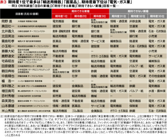 東証33業種分類のうち、「期待度1位」として挙げられたものだけでも、「輸送用機器」と「医薬品」をそれぞれ3氏が挙げ、「建設業」と「機械」と「不動産業」と「情報・通信業」をそれぞれ2氏が挙げ、そのほかにも「電気機器」と「倉庫・運輸関連業」と「証券、商品先物取引業」と「卸売業」が挙げられているのだから。
