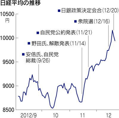 「安倍ノミクス」の賞味期限、来年度国債44兆円枠が焦点 日本経済新聞 編集委員:土屋直也 2012/12/24 7:00 http://www.nikkei.com/money/column/teiryu.aspx?g=DGXZZO4986273021122012000000 日経平均が一時1万円台に乗せ、円安傾向を生み出した安倍晋三自民党総裁が今週は首相に就任する見通し。「安倍ノミクス」は上々の滑り出しにも見えるが、いつまで市場の評価をつなぎ留められるか。賞味限が切れるとすれば、時期はいつなのだろうか。 興味のある方は、"つづきはこちらです"をクリック!